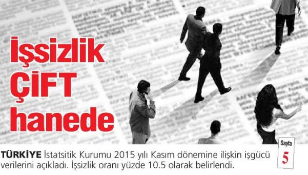 TÜRKİYE İstatsitik Kurumu 2015 yılı Kasım dönemine ilişkin işgücü verilerini açıkladı. Resmi işsizlik oranı yüzde 10.5 olarak gerçekleşti. Böylece işsizlik oranı son 4 aydır yüzde çift hanede artmayı sürdürdü.