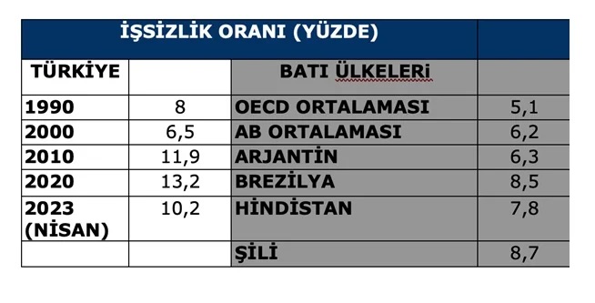Öte yandan Dünya işsizliği çözmüş iken biz hâlâ kronik işsizlik yaşıyoruz. Söz gelimi, kriz içindeki Arjantin’de bile işsizlik oranı yüzde 6,3’tür.