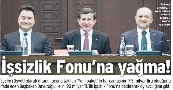 Seçim rüşveti olarak oltanın ucuna takılan ´Yeni paket´ in harcamasının 7,5 milyar lira olduğunu ifade eden Başbakan Davutoğlu, elini 90 milyar TL´lik İşsizlik Fonu´na daldırarak oy avcılığına çıktı