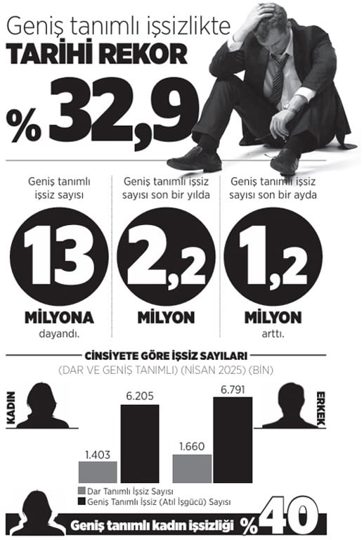 İktidardan ‘Ekonomi şahlanacak’ açıklamaları ardı ardına gelirken şahlanan işsizlik oldu. TÜİK’e göre geniş tanımlı işsizlik yüzde 32,9’a yükseldi.