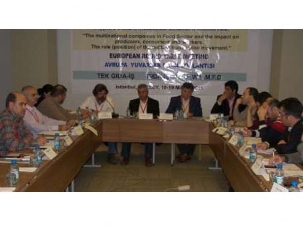 “Gıda Sektöründeki çok uluslu şirketlerin üreticilere, tüketicilere ve işçilere etkileri; mücadeleci sendikal hareketin rolü” başlıklı yuvarlak masa toplantısında uluslararası sendikal hareketin geleceği, gıda sektöründeki çok uluslu şirketlerin işçi sınıfına etkileri, tarımsal politikaların çiftçilere ve tüketicilere yansımaları üzerinden tartışıldı.