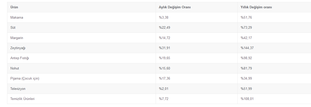 Zeytinyağının ardından en çok fiyat artışı temizlik ürünlerinde yaşandı. Temizlik ürünlerine gelen zam yıllık bazda yüzde 108,01 oldu. Zeytinyağını yüzde 98,92 ile antep fıstığı, yüzde 81,79 ile nohut, yüzde 73,29 ile süt, yüzde 51,99 ile televizyon, yüzde 51,76 ile makarna ve yüzde 42,17 margarin takip etti.