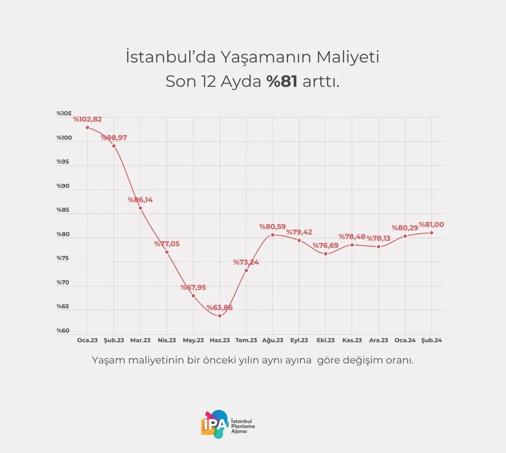 Bir önceki yılın şubat ayına göre ise İstanbul’da yaşam maliyetinin yıllık (son 12 ay) artış oranı yüzde 81,00 olarak gerçekleşti.