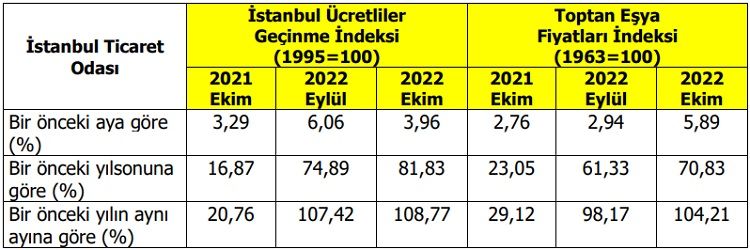 2021 Ekim ayına göre 2022 Ekim ayında yaşanan fiyat değişimlerini gösteren bir önceki yılın aynı ayına göre değişim oranı, İstanbul Ticaret Odası’nın (İTO) 1995 bazlı Ücretliler Geçinme İndeksinde %108,77, Toptan Eşya Fiyatları İndeksinde ise %104,21 olarak gerçekleşti. Böylece İstanbul’da hem perakende hem toptan fiyatlarda, yıllık artış oranı 3 hanelere çıktı.