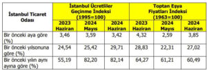 2023 Haziran ayına göre 2024 Haziran ayında yaşanan fiyat değişimlerini gösteren bir önceki yılın aynı ayına göre değişim oranı İstanbul Ticaret Odası’nın (İTO) 1995 bazlı Ücretliler Geçinme İndeksinde yüzde 82,14, Toptan Eşya Fiyatları İndeksinde ise yüzde 60,49 olarak gerçekleşti.