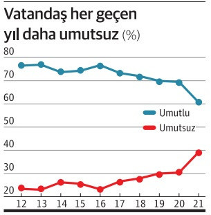 2012-2016 döneminde vatandaşların umutlu ve umutsuz olanlarının oranı hemen hemen hiç değişmemiş. 2017 ile birlikte umutsuzların payı artarken, umutluların payı doğal olarak gerilemeye başlamış. Geçen yıl makas neredeyse 10 puan daha daralmış ve 2021 itibarıyla her 100 kişinin 60’ı umutlu, 40’ı umutsuz olduğunu belirtmiş.