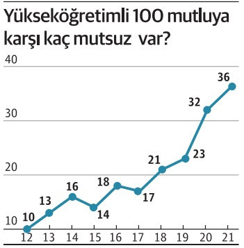 Yanıt grafikte… On yıl önce, 2012’de üniversite mezunu ve mutlu 100 kişiye karşılık 10 kişi mutsuzken, sayı son iki yıl tırmanışa geçmiş ve 2021’de 36’ya yükselmiş.