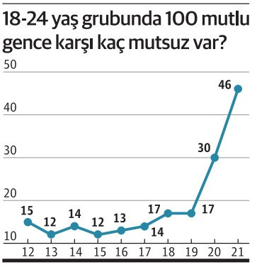 Geldik 2021’e… Mutlu gençlerin oranı yüzde 44’e inmiş, buna karşılık mutsuzların oranı yüzde 20’ye tırmanmış. Yani mutlu her 100 gence karşılık artık tam 46 mutsuz genç var.