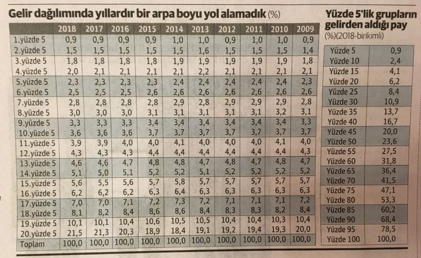 Gelir dağılımındaki çarpıklık yıllardır neredeyse aynı. İyiye gidiş sağlayamıyoruz, hatta bazı yıllarda gelir dağılımındaki bozukluğun daha da belirginleşmesini önleyemiyoruz. 2018 de bu yıllardan biri.