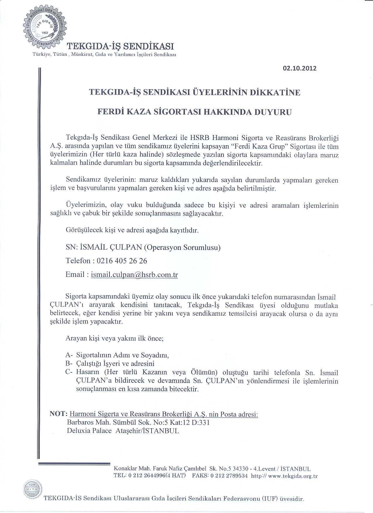 TEKGIDA-İŞ Sendikası’nın tüm üyelerini kapsama alan Ferdi Kaza Sigortası uygulaması aksaksız bir şekilde yürüyor.