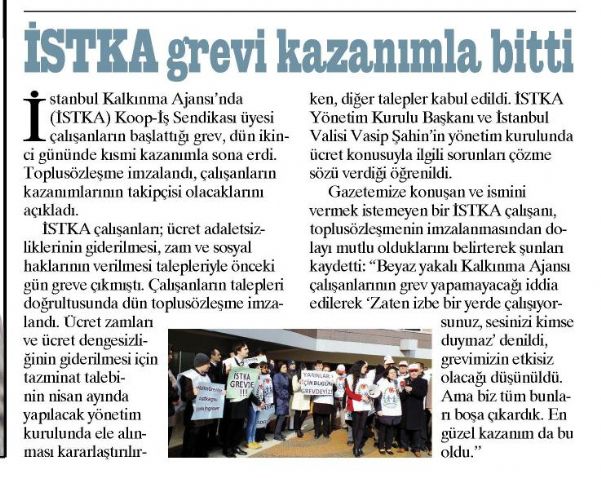 İSTKA Yönetim Kurulu Başkanı ve İstanbul Vahşi Vasip Şahin’in yönetim kurulunda ücret konusuyla ilgili sorunları çözme sözü verdiği öğrenildi. Gazetemize konuşan ve ismini vermek istemeyen bir İSTKA çalışanı, toplusözleşmenin imzalanmasından dolayı mutlu olduklarını belirterek şunları kaydetti: "Beyaz yakalı Kalkınma Ajansı çalışanlarının grev yapamayacağı iddia edilerek ‘Zaten izbe bir yerde çalışıyorsunuz, sesinizi kimse duymaz’ denildi, grevimizin etkisiz olacağı düşünüldü. Ama biz tüm bunları boşa çıkardık. En güzel kazanım da bu oldu."