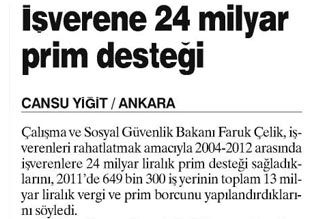Çalışma ve Sosyal Güvenlik Bakam Faruk Çelik, işverenleri rahatlatmak amacıyla 2004-2012 arasında işverenlere 24 milyar liralık prim desteği sağladıklarım, 2011´de 649 bin 300 iş yerinin toplam 13 milyar liralık vergi ve prim borcunu yapılandırdıklarını söyledi.