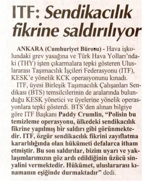 Hava işkolundaki grev yasağına ve Türk Hava Yollarındaki (THY) işten çıkarmalara tepki gösteren Uluslararası Taşımacılık İşçileri Federasyonu (ITF), KESK´e yönelik KCK operasyonunu kınadı. ITF, üyesi Birleşik Taşımacılık Çalışanları Sendikası (BTS) temsilcilerinin de aralannda bulunduğu KESK yönetici ve üyelerine yönelik operasyonlara tepki gösterdi.