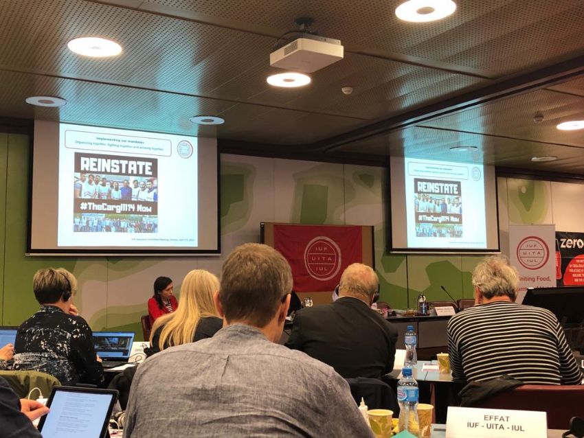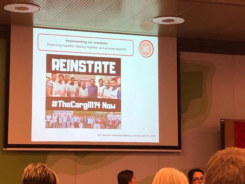 2Nisan 2019 Salı günü yapılan Stratejik Liderlik, 3 Nisan 2019 Çarşamba günü yapılan İcra Komitesi ve 4 Nisan Perşembe günü yapılan Yönetim Kurulu toplantılarında da sendikal mücadeleye ilişkin üye ülkelerin raporları konuşuldu. IUF’in başlattığı Coca Cola ve Cargill imza kampanyalarına ilişkin ayrıntılı bilgi paylaşımı oldu. Sendikamız üyesi oldukları için işten atılan 14 Cargill işçisinin mücadelesinin konu edildiği IUF toplantılarında, mücadelemizden övgüyle söz edildi ve direnişe uluslararası dayanışma için başlatılan kartpostal kampanyasına ve maddi desteğe de vurgu yapıldı. IUF Başkanı Mark Lauritsen ABD merkezli Cargill şirketi ile IUF olarak temasa geçmeye çalıştıklarını vurgulayarak, “Cargill, IUF’i tanımama ve iletişime geçmeme konusunda ısrarlı. Üretim Müdürü ile görüşebildik. Bize ‘Cargill IUF’i asla tanımayacaktır’ dedi. Asla zannettikleri gibi sonsuz bir zamanı ifade etmiyor. Asla bizim için çok kısa ve erişilebilir bir zaman dilimidir.”dedi. Direnişteki Cargill işçileri için şimdiye kadar 8 bin 300 imza toplandığını da ifade eden IUF Başkanı, Tekgıda-İş’e ve Cargill işçilerine ABD’deki sendikanın desteğinin de süreceğinin altını çizen IUF Başkanı, IUF üyesi diğer sendikalara da Cargill’de üyesi olsun, olmasın destek verme çağrısı yaptı.