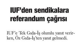 ULUSLARARASI Gıda İşçileri Federasyonu (IUF), işyerlerinde yaşanan anlaşmazlıkları çözmek için referandum önerdi. Tekgıda-İş ile Öz Gıda-İş arasında çoğunluk itirazlarının yaşandığı işyerlerinde referandum çağrısı yapan IUF´e Tekgıda-İş olumlu yanıt verirken, Öz Gıda-İş´ten yanıt gelmedi.