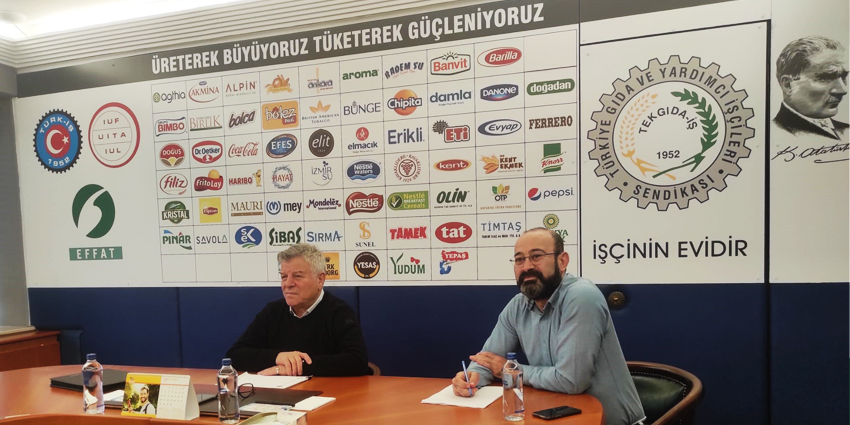 Genel Başkanımız Mustafa Türkel ve Dış İlişkiler Danışmanımız Erdinç Ergenç Zoom platformu üzerinden IUF Genel Başkanı Mark Lauritsen, Genel Sekreter Sue Longley, Eski Genel Sekreter Ron Oswald ve Ofis çalışanları Sarah Meyer ve Burcu Ayan’la bir toplantı gerçekleştirdi. Genel Başkanımız Mustafa Türkel, Cargill mücadelesindeki başarıda IUF’in destek ve motivasyonunun büyük katkısı olduğunu söyledi. IUF Başkanından uzmanlarına kadar bu mücadelede katkısı olan herkese tek tek teşekkür eden Genel Başkanımız, sınıf mücadelesinde uluslararası dayanışmanın çok önemli olduğunu da vurguladı. Sürece ilişkin bilgi paylaşımının da yapıldığı toplantı karşılıklı dilek ve temennilerin aktarılmasıyla son buldu.