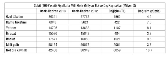 Ocak-Mart 2013’te milli gelir yüzde 3,7 oranında artmış, böylece bir önceki yılın aynı aylarında gerçekleşen yüzde 3’lük büyüme yukarı çekilmiştir. Açıklayıcı anahtar tablonun son satırındadır: İlk dört ayın toplam dış kaynak hareketleri, Mayıs-Haziran’daki gerilemeyi fazlaca telafi etmiş, bir önceki yıla göre yüzde 16,7 oranında artmıştır. Bu katkı adım adım aşınmaktadır.