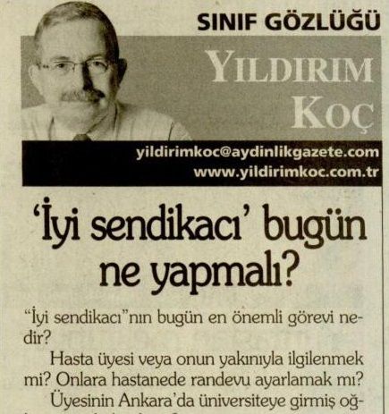 İyi sendikacının bugün en önemli görevi nedir? Hasta üyesi veya onun yakınıyla ilgilenmek mi? Onlara hastanede randevu ayarlamak mı? Üyesinin Ankara´da üniversiteye girmiş oğluna yurt bulmak mı? Toplu sözleşmenin uygulanmayan maddelerinin uygulanmasını sağlamak mı? İyi bir toplu sözleşme yapmak, üyelerin gerçek ücretlerini artırmak, yıllık ücretli izin sürelerini uzatmak mı?