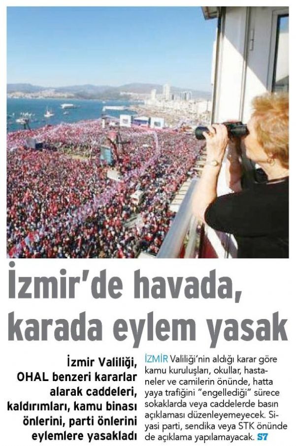 İZMİR Valiliği´nin aldığı karara göre kamu kuruluşları, okullar, hastaneler ve camilerin önünde, hatta yaya trafiğini engellediği sürece sokaklarda veya caddelerde basın açıklaması düzenleyemeyecek. Siyasi parti, sendika veya STK önünde de açıklama yapılamayacak.