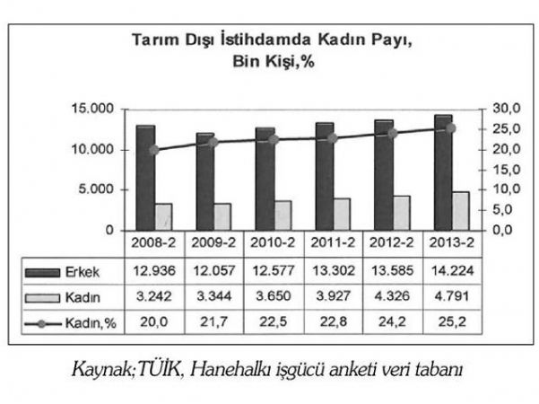 Son yıllarda sayılann işaret ettiği bir gerçeklik var; kadın ücretli sayısında artışın temposu yükseldi; erkeklerle fark, biraz olsun daralıyor. Tanmı bir yana bıraktığımızda, 2008 in şubat ayında 3,2 milyon kişi olarak saptanan kadın çalışan sayısı 2013ün ikinci ayında 4,8 milyona yaklaşmış. Yani 6 yılda yüzde 50 dolayında bir artış… Son 6 yılda kentlerde kadın çalışan sayısında 1,5 milyonun üstünde bir artıştan söz ediyoruz…