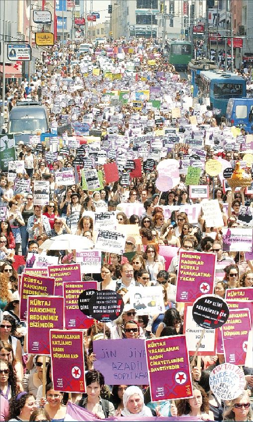 KESK’li Kadınlar, TMMOB İstanbul Kadın Komisyonu, Kadın Mühendisler Grubu, Üniversiteli Kadın Kolektifi, İmece Kadın Sendikası, Feminist Kadınlar, Gökkuşağı Kadın Derneği, İnsan Hakları Derneği, Emekçi Hareket Partisi (EHP), Özgürlük ve Dayanışma Partisi (ÖDP), Türkiye Komünist Partisi (TKP) ile Emek Partili Kadınlar, Sosyalist Kadın Meclisi, Halkevci Kadınlar, Halkların Demokratik Kongresi’nin de aralarında bulunduğu çok sayıda siyasi parti, meslek odası, sivil toplum üyesi kadınlar dün Kadıköy Altıyol’da bir araya geldi. Renkli görüntülere sahne olan eylemde kadınlar, davullar ve düdükler çalarak Kadıköy İskele Meydanı’na doğru yürüyüşe geçti. “Kürtaj hakkımızı tartıştırmıyoruz. Bedenimiz bizimdir”, “Kürtaj haktır, Uludere katliamdır”, “Kürtajı yasaklamak, kadın cinayetlerine davetiyedir”, “Melih Gökçek’i yumurtaladık. Sıra kimde?” yazılı pankart ve dövizler açan kadınlar, “Yaşasın kadın dayanışması”, “Susma haykır, kürtaj haktır”, “AKP elini bedenimden çek” sloganları attı. CHP İstanbul Milletvekili Melda Onur, Türk halk müziği sanatçısı Pınar Aydınlar (Sağ), oyuncu Feride Çetin’in de katıldığı mitinge erkekler de katılarak destek verdi. Yürüyüşte “Türkiye kadın düşmanlığında birinci” yazılı Başbakan Erdoğan’ın maketinin yanı sıra tavuk ve yumurta maketlerini taşınması, kucağında çocuğunu taşıyan bir annenin “Benim bedenim, benim kararım” yazılı tişörtle yürümesi ise dikkat çekti. Kadıköy İskele Meydanı’nda Türkçe ve Kürtçe okunan basın açıklamasında, AKP hükümetinin kadınların bedenini, kimliğini ve emeğini devletin, erkeklerin ve sermayenin hâkimiyeti altına sokmak istediği belirtildi.