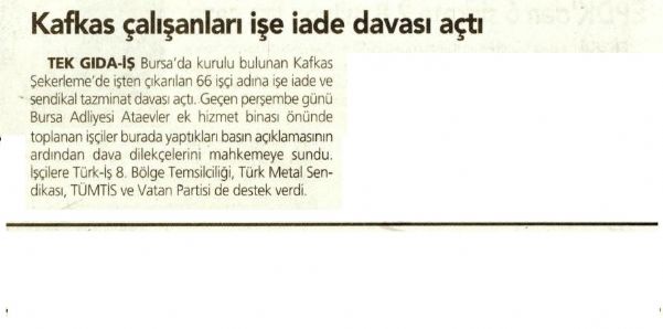 Tekgıda-İş Bursa´da kurulu bulunan Kafkas Şekerleme´de işten çıkarılan 66 işçi adına işe iade ve sendikal tazminat davası açtı.