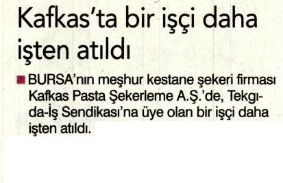 BURSA´nın meşhur kestane şekeri firması Kafkas Pasta Şekerleme A.Ş.´de, Tekgıda-İş Sendikası´na üye olan bir işçi daha işten atıldı.