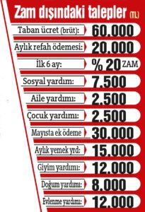 Zamlı maaşa 2026 yılı sonuna kadar ise her 6 ayda bir TÜFE + yüzde 5 oranında zam yapılması talep ediliyor. Ücretin dışında her bir işçiye aylık net 7 bin 500’er lira sosyal destek, 2 bin 500’er lira aile yardımı, çocuk başına da 250’şer lira çocuk yardımı istendi. Bu talebin karşılanması halinde örneğin 2 çocuklu bir işçi maaşının dışında her ay 10 bin 500 lira da destek ödemesi alacak. Yardım paraları her 6 ayda bir TÜFE+yüzde 5 oranında artacak. Ayrıca 700 bin işçinin tamamına önümüzdeki mayıs ayında 30’ar bin lira ek ödeme talep edildi. 2026 Nisan ayında bu tutar yıllık TÜFE + yüzde 5 zamlı ödenecek. İşçilere günlük 500 TL (aylık 15 bin TL) yemek, yıllık 12 bin lira giyim desteği istendi. Ayrıca 8 bin lira doğum, 12 bin lira da evlenme yardımı talep edildi.