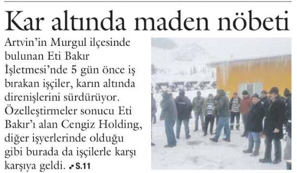 Artvin´in Murgul ilçesinde bulunan Eti Bakır İşletmesi´nde 5 gün önce iş bırakan işçiler, karın altında direnişlerini sürdürüyor. Özelleştirmeler sonucu Eti Bakır´ı alan Cengiz Holding, diğer işyerlerinde olduğu gibi burada da işçilerle karşı karşıya geldi