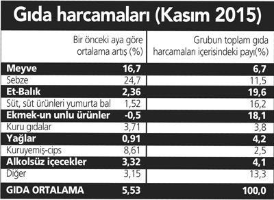 Gıda için yapılan her 100 liralık harcamanın 6.7 lirasının meyve, 11.5 lirasının sebze, 19.6 lirasının et, et ürünleri ve balık, 16.2 lirasının süt, süt ürünleri, yumurta ve bal, 18.1 lirasının ekmek, un ve unlu ürünler, 3.8 lirasının kuru gıda, 4.2 lirasının yağ, 2.5 lirasının kuruyemiş, cips, 4.1 lirasının alkolsüz içecekler, 13.3 lirasının konserve, şeker, çay, kahve ve diğer ürünler için harcandığı belirtildi.