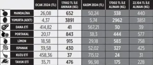 Ocak 2024’te asgari ücret tutarı ile 652 kilo mandalina alınırken Kasım’da 338 kiloya geriledi. 22 bin 104 lira ile alınan mandalina ise 440 kiloda kaldı. Asgari ücret, çalışanların eline Şubat ayında geçecek. Ancak Kasım fiyatlarıyla 22 bin 104’lik asgari ücretin mandalina fiyatı karşısındaki alım gücü kaybı şimdiden 212 kg mandalina oldu. Asgari ücret, ele geçene kadar bu kaybın daha da artması bekleniyor.