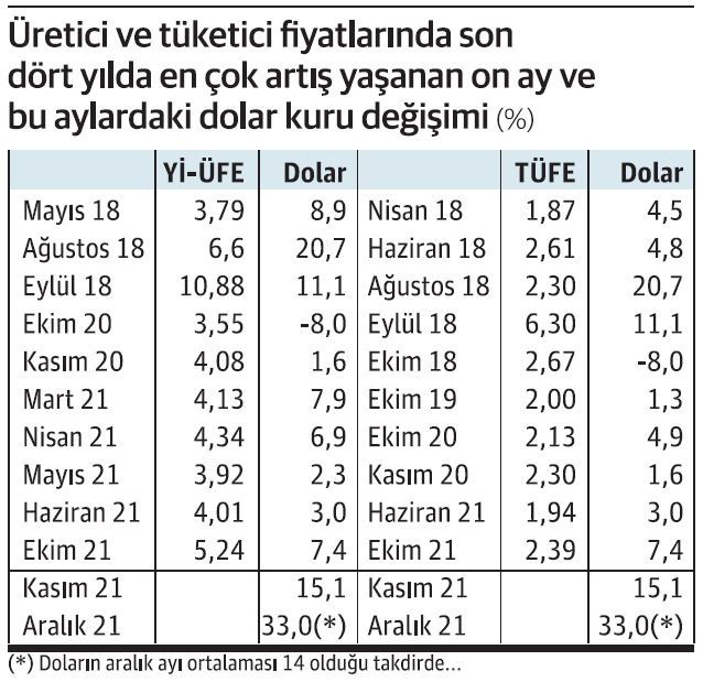 Kur-fiyat geçişkenliğini görmek için son dört yılın verilerinden bir tablo oluşturduk. Üretici ve tüketici fiyatlarının son dört yılda en çok artış gösterdiği ayları çıkardık ve bu aylardaki dolar kuru değişimine baktık.