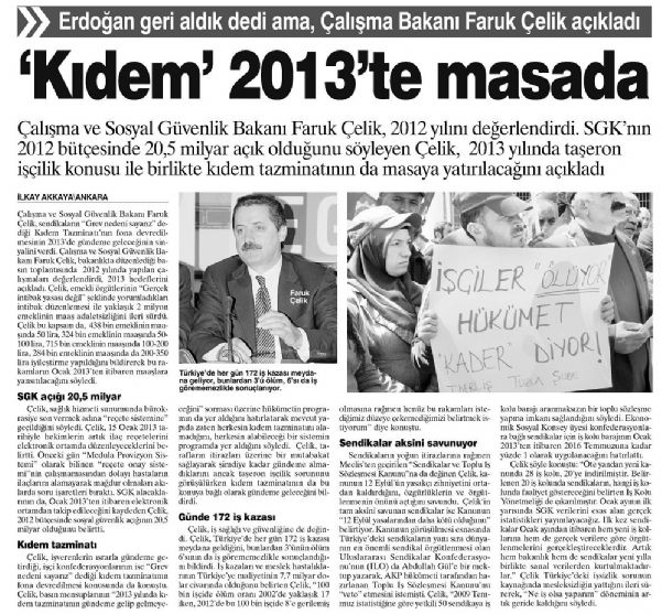 Erdoğan geri aldık dedi ama, Çalışma Bakanı Faruk Çelik açıkladı. Bakan Faruk Çelik, 2012 yılını değerlendirdi. SGK´nın 2012 bütçesinde 20,5 milyar açık olduğunu söyleyen Çelik, 2013 yılında taşeron işçilik konusu ile birlikte kıdem tazminatının da masaya yatırılacağını açıkladı.