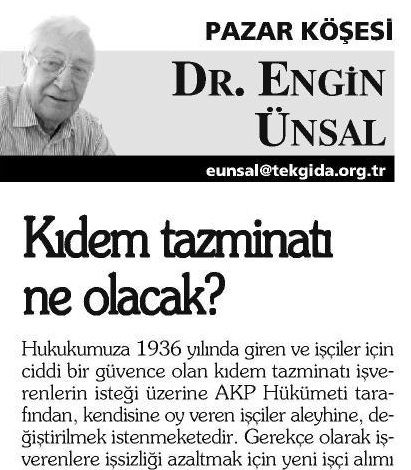 Hukukumuza 1936 yılında giren ve işçiler için ciddi bir güvence olan kıdem tazminatı işverenlerin isteği üzerine AKP Hükümeti tarafından, kendisine oy veren işçiler aleyhine, değiştirilmek istenmektedir. Gerekçe olarak işverenlere işsizliği azaltmak için yeni işçi alımı olanağı yaratmak, işsizlik sigortasının kurulmuş olması ve iş güvencesi hükümlerinin İş Yasası’nda yer alması gösterilmektedir.