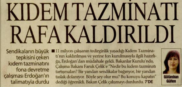 Çalışanlar aleyhine uygulamalarla dolu Kıdem Tazminatı taslağının kamuoyunda yarattığı tepkiyi gören Başbakan Erdoğan, Pazartesi günü yapılan Bakanlar Kurulu toplantısında Çalışma Bakanı Faruk Çelik´e çıkıştı. Erdoğan, Nedir bu tartışmalar? Bir yandan sendikalar bağırıyor, bir yandan ortada bir taslak dolamyor. Kaldırın bu çalışmayı. Kıdem Tazminatı bugünün konusu değil. Bu konuyu kapatın. Taraflara da söyleyin talimatı verdi.
