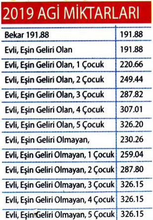 Asgari ücret 2019 için yüzde 26.05’lık zamla aylık brüt 2558.40 TL oldu. Asgari ücret net olarak 2020.90 TL, günlük brüt ise 85.28 TL olarak açıklandı. Asgari ücretle birlikte AGİ de maaşlara zamlı yansımaya başladı. Gelir Vergisi Kanunu’na göre 2008’den itibaren ücretlerin vergilendirilmesi sırasında AGİ uygulanıyor.