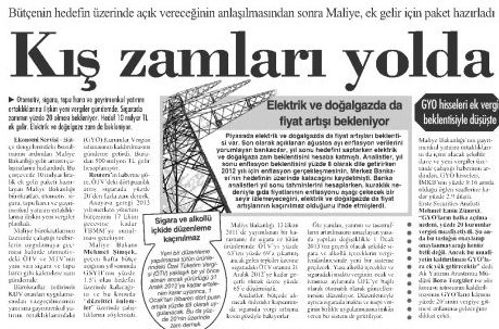 Piyasada elektrik ve doğalgazda da fiyat artışları beklentisi var. Son olarak açıklanan ağustos ayı enflasyon verilerini yorumlayan bankacılar, yıl sonu hedefini saptarken elektrik ve doğalgaza zam beklentisini hesaba katmıştı. Analistler, yıl sonu enflasyon beklentisini yüzde 8 olarak dile getirirken 2012 yılı için enflasyon gerçekleşmesinin, Merkez Bankası’nın hedefinin üzerinde kalacağını kaydetmişti. Banka analistleri yıl sonu tahminlerini hesaplarken, kuraklık nedeniyle gıda fiyatlarının enflasyonu aşağı çekecek bir seyir izlemeyeceğini, elektrik ve doğalgazda da fiyat artışlarının kaçınılmaz olduğunu ifade etmişlerdi.
