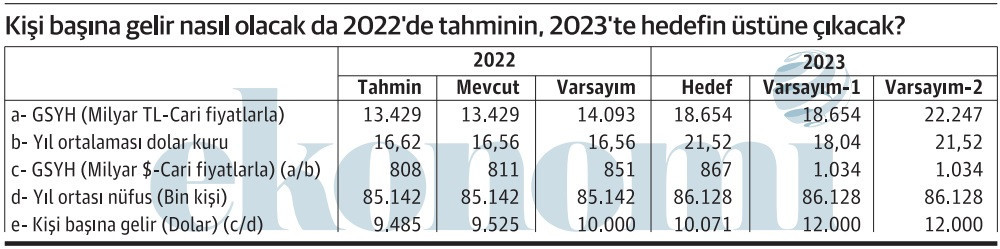 Eğer GSYH 22.2 trilyon liraya çıkarsa ve dolar kuru da OVP’de öngörülen 21.52 düzeyinde oluşursa kişi başına gelir 12 bin dolar olacak.