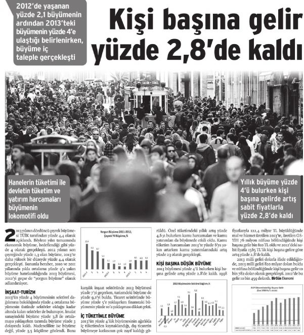 Kişi başına gelir yüzde 2,8´de kaldı 2012´de yaşanan yüzde 2,1 büyümenin ardından 2013´teki büyümenin yüzde 4´e ulaştığı belirlenirken, büyüme iç taleple gerçekleşti Yıllık büyüme yüzde 4´ü bulurken kişi başına gelirde artış sabit fiyatlarla yüzde 2,8´de kaldı