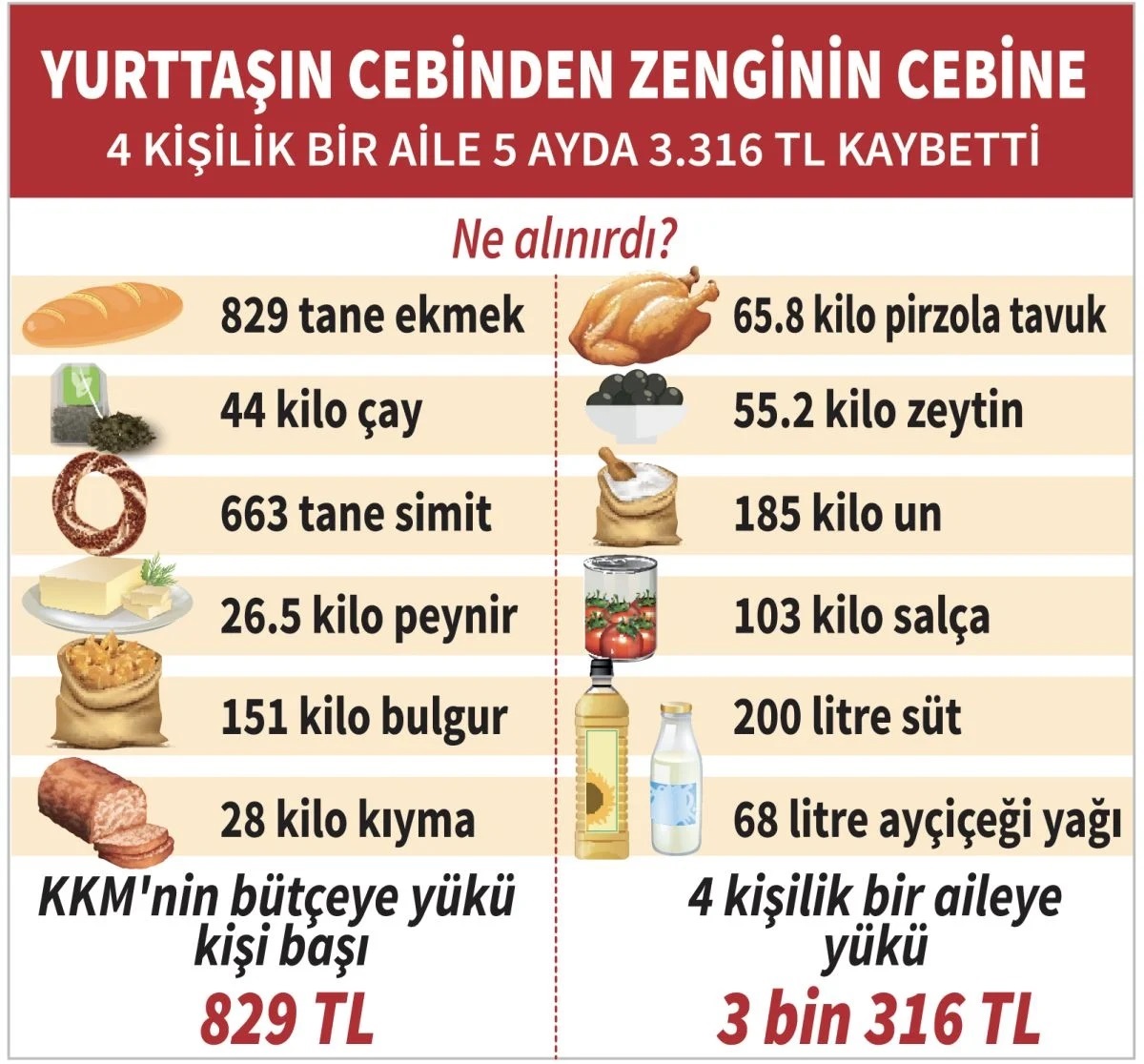 Ekonomi yazarı Alaaddin Aktaş, marttan bu yana beş ayda toplam ödenen miktar 60.6 milyar lira olurken 10.2 milyar liralık vergi avantajıyla birlikte “bilinen” maliyetin “şimdilik” 70.8 milyar lira olduğunu vurguladı. Bu rakam üzerinden yaptığı hesaplamada ise 5 ayda 85.5 milyon Türkiye Cumhuriyeti vatandaşının cebinden 829 lira alındığını söyledi. Bu rakam dört kişilik bir ailede 3 bin 316 lira yapıyor. Yurttaşlar yağmurda, karda ucuz gıda kuyruklarına girmişken ülkede çalışanların yaklaşık yüzde 60’ı asgari ücret seviyesinde maaş alırken bir ailenin cebinden çıkan bu para ile neler alınabileceğini hesapladık. Bir aile bu para ile her gün 5.5 ekmek alabilirdi. Ayrıca 5 ayda 200 litre süt, 829 ekmek, 44 kilo çay, 151 kilo bulgur, 26.5 kilo peynir, 28 kilo kıyma, 103 kilo salça da alabilirdi.