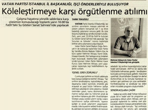 Bu adımların bir kısmının atıldığını, bir kısmının da hazırlıklarının yapıldığını görüyoruz" ifadelerini kullandı. İşçi sınıfının bu saldırılara karşı topyekûn direnişe geçmesi ve genel greve çıkması gerektiğini vurgulayan Akkaya, sendikaların yapması gerekenler için şunları söyledi: "Bu saldırıların her birisi genel grev Mehmet Akkaya’yla Vatan Partisi İstanbul II Başkanlığı’nda görüştük. sebebidir, işçi sınıfının kazandığı bütün haklar hedef alınmaktadır. AKP’nin bir dakika bile hükümette kalmaması gerekir. Sendikaların buna göz yumması büyük gaflettir. Hükümet uyarılmalı, Ulusal istihdam Stratejisi’nin derhal durdurulması ve bu konuda hazırlanan tasarıların geri çekilmesi için süre verilmelidir. Konfederasyonlar ve sendikalar tez elden ortak mücadele programı oluşturmalıdır."