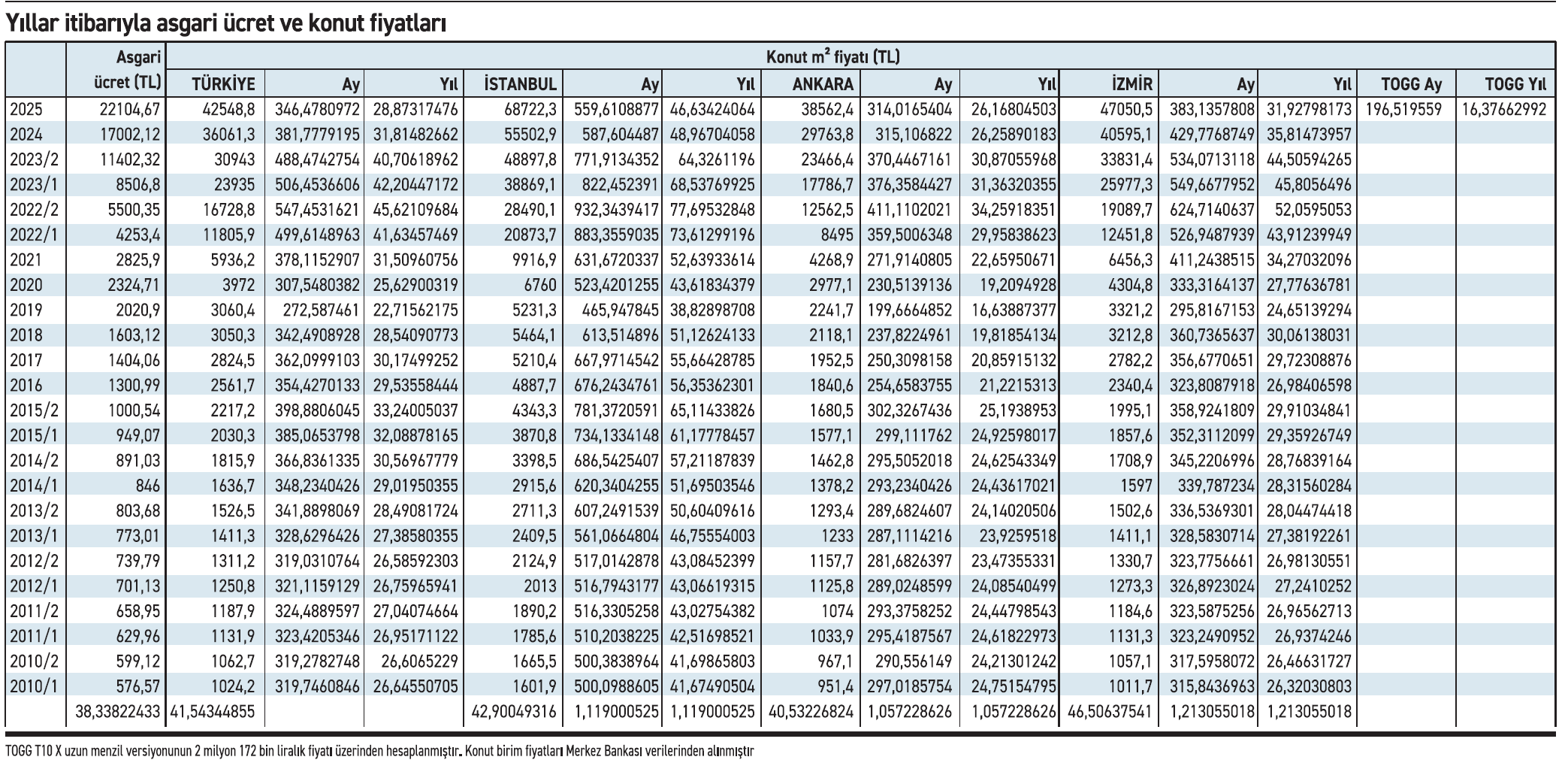 Asgari ücretin 2010 yılından bu yana gelişimine bakıldığında asgari ücret 577 liradan 22 bin 104 liraya çıkarak 38.3 kat artmış. Buna karşılık Türkiye’de ortalama konut metrekare birim fiyatı 1024 liradan 42 bin 548 liraya çıkarak 41 kat artış göstermiş. Aynı dönemde konut metrekare fiyatı 43 kat artarak 68 bin 722 liraya, Ankara’da 40 kat artarak 38 bin 562 liraya, İzmir’de ise 46 kat artarak 47 bin 50 liraya yükseldi.