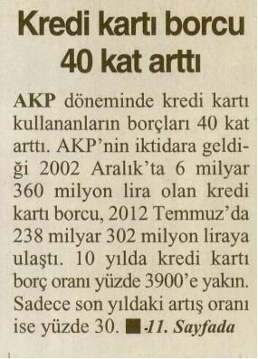 Borçlar 40 kat arttı: AKP ile kredi kartı borçlan 40 kat arttı. AKP’nin iktidara geldiği 2002 yılının Aralık ayında 6 milyar 360 milyon lira olan kredi kartı borcu, 2012 yılının Temmuz ayında 238 milyar 302 milyon liraya ulaşmıştır. 10 yılda artan kredi kartı borç oranı yüzde 3900’e yakındır. Sadece son yıldaki artış oranı ise yüzde 30’dur.