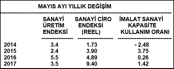 Sanayide ciro artışını, sanayi üretim artışı ve İmalat sanayiinde kapasite kullanım oranı ile birlikte yorumlamak gerekir. Bu çerçevede Mayıs ayında sanayi üretim endeksi de yüzde 3.5 oranında ve İmalat sanayi kapasite kullanım oranı da yüzde 1.42 oranında arttı. (Aşağıdaki tablo )