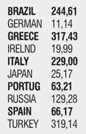 Dış borç riskini gösteren , dış borç risk primi , iflas etmiş Yunanistan’dan daha yüksektir. Birkaç krizdeki ülke sayılmazsa  bu demektir ki dünyanın en riskli ülkesi olarak görülüyoruz. Risk primi  bir yıl önce 188.02 iken bu sene dün itibariyle 327.26 ‘ya kadar çıktı.(Dünkü CDS Tablosu aşağıdaki gibiydi.)