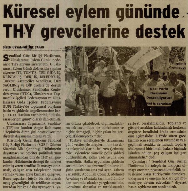 Sendikal Güç Birliği Platformu, "Uluslararası Eylem Günü" nedeniyle THY grevini ziyaret etti. Uluslararası Eylem Günü dolayısıyla yapılan ziyarete ITF, TÜMTİŞ, TEK GIDA-İŞ, KRİSTAL-İŞ, DERİ-İŞ, BELEDİYE-İŞ, Türkiye Gazeteciler Sendikası, DEV SAĞLIK-İŞ ve DİP üyeleri de destek verdi.
