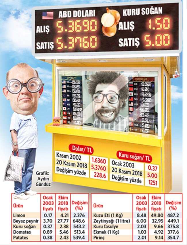 TÜİK’in gıda sepetinde yer olan ortalama fiyatlar ile bugün market raflarında yer alan ürünlerin fiyatları arasında da büyük bir uçurum var. Ekim ayında TÜİK’in 2.38 lira olarak hesapladığı kuru soğan tarlada 1,5 liraya, markette ise 5 liraya satılıyor. TÜİK’in 2.43 lira olarak belirlediği patates ise dün itibarıyla markette 3.95 liradan satılıyordu. AKP’nin iktidara geldiği 2002 yılının Kasım ayında 1.6360 lira olan dolar dün 5.3760 liradan işlem gördü. 16 yıllık dönemde dolardaki artış yüzde 228.6 seviyesinde kaldı. Böylece AKP döneminde kuru soğanın fiyatı dolara göre yaklaşık 5 katından fazla değer kazandı.
