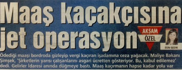 Ödediği maaşı bordroda gizleyip vergi kaçıran işadamına ceza yağacak. MALİye Bakanı Şimşek, ‘Şirketlerin yarısı çalışanlarını asgari ücretten gösteriyor. Bu kabul edilemez’ dedi. Gelirler İdaresi anında düğmeye bastı. Maaş kaçırmanın hapse kadar yolu var. BORDRO oyunu’yla vergi kaçırıp eksik prim yatıran patrona ceza geliyor. Gelirler İdaresi, MALİye Bakanı Şimşek’in açıklamasından birkaç saat sonra acil toplandı. Eylem planı anında hazırlanıp işleme kondu. Şirketlere "Kaç işçi çalıştırıyorsunuz? Ne kadar ücret alıyorlar? Bordrolarını ve banka dökümlerini içeren belgeleri hemen gönderin" çağrısı yapılıyor.