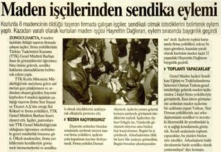 Kozlu´da 8 madencinin öldüğü taşeron firmada çalışan işçiler, sendikalı olmak istediklerini belirterek eylem yaptı. Kazadan yaralı olarak kurtulan maden işçisi Hayrettin Dağkıran, eylem sırasında baygınlık geçirdi.
