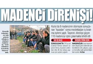 Kozlu´da 8 madencinin ölümüyle sonuçlanan kazadan sonra meslektaşları iş bırakma eylemi yaptı. Taşeron, direnişe geçen 110 madenciyi işten çıkarmakla tehdit etti Güvenlik önlemlerinin hâlâ yetersiz olduğunu söyleyen madenciler, Artık kölelikten kurtulmak istiyoruz dedi.